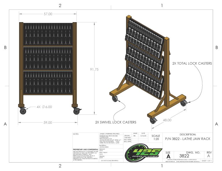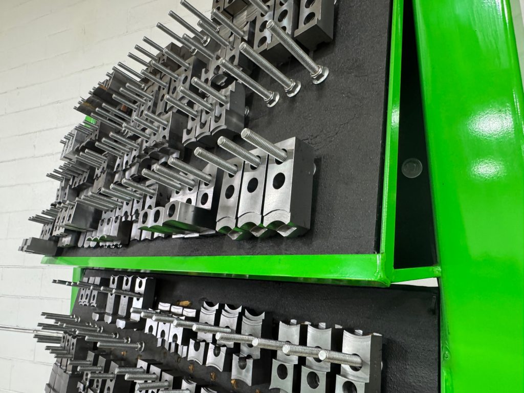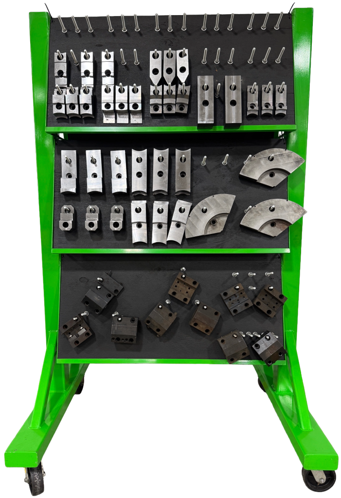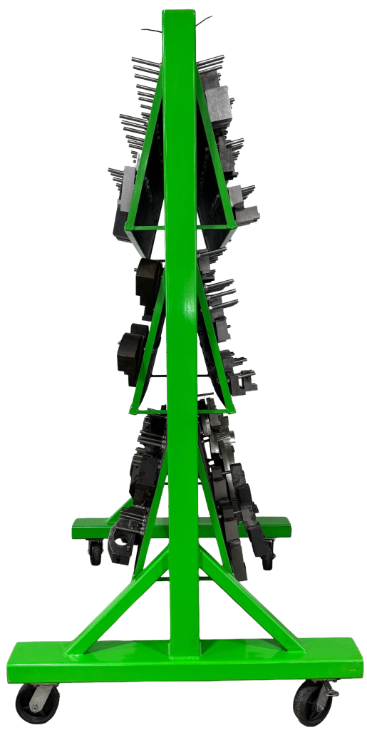 | Key Features • Dual-sided rack (6 total holders) • 15° angled holders prevent sliding/tipping • One-hand jaw access • Rolls smoothly fully loaded | Benefits • Centralized jaw storage • Faster jaw changeovers • Compact footprint, high density • Built for full-time production |