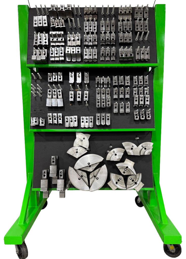 | Use Cases • Organize by machine, chuck, or job • Place near tool crib or lathe cell • Color-code by workcell or branding | Machine Compatibility • CNC lathes, turning centers, manual lathes • Jaw Sizes: 6″–18″ |
