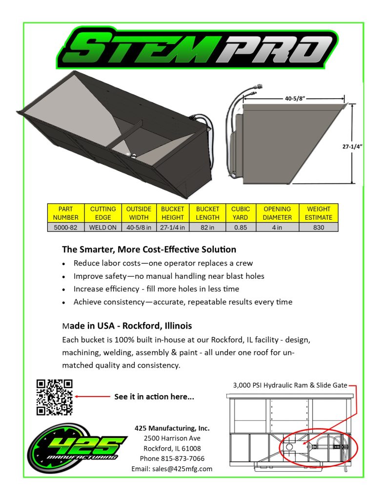 When it comes to loading stemming material into blast holes, efficiency and safety matter. Traditional methods—laborers using shovels or small buckets—are slow, inconsistent, and dangerous. There’s no reason to put your crew at risk when a Hydraulic Stemming Bucket from 425 Manufacturing can do it faster, safer, and more accurately every single time.